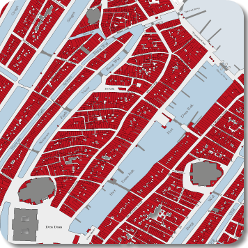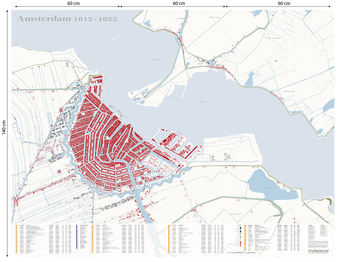 MapFactory heeft de 80 oude kaarten van wat nu Amsterdam is uit begin 1800 samengesteld en opnieuw getekend. Resultaat, een uniek en zeer gedetailleerd beeld van Amsterdam van vlak na de machtswisseling van Napoleon in 1813 en onze eerste Koning Willem I der Nederlanden, Willem Frederik Prins van Oranje-Nassauuit de periode 1813 - 1840.
