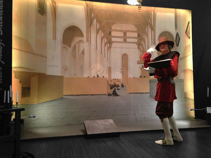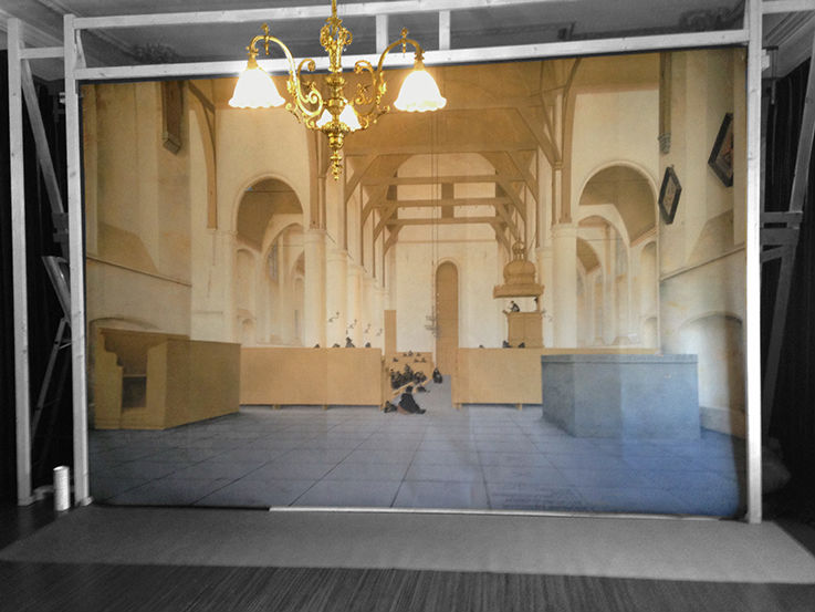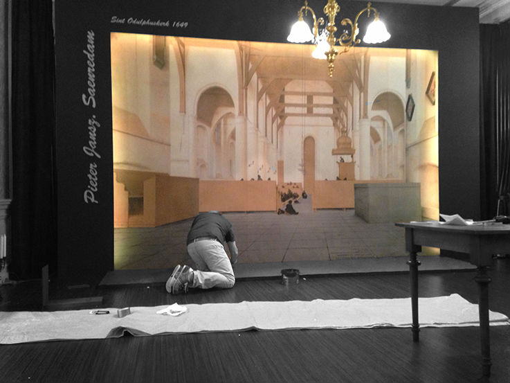 50x75 cm is, hebben we uitvergroot naar 350x525 cm en in perspectief doorgetrokken over de vloer om een zo realistisch beeld te geven van de ruimte. Zelfs de kroonluchter in de ruimte komt in perspectief uit in het schilderij. Dit alles sluit volledig aan bij de regels van het perspectief tekenen van Pieter Janz. Saenredam zoals hij die toepaste.