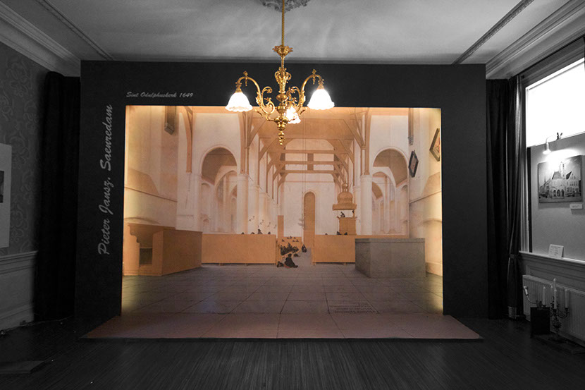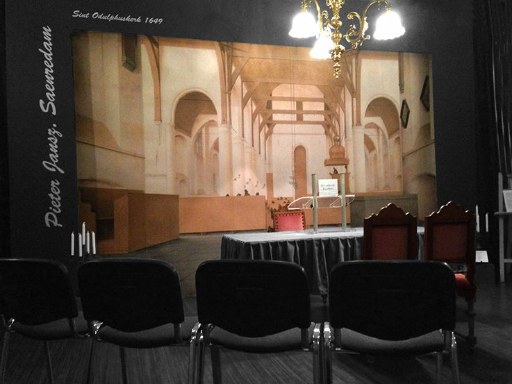 • Voor de inrichting van de bovenzaal is in overleg met de commissie besloten een sterk uitvergroot beeld te maken van een schilderij uit 1649 van de Sint Odulphuskerk te Assendelft.