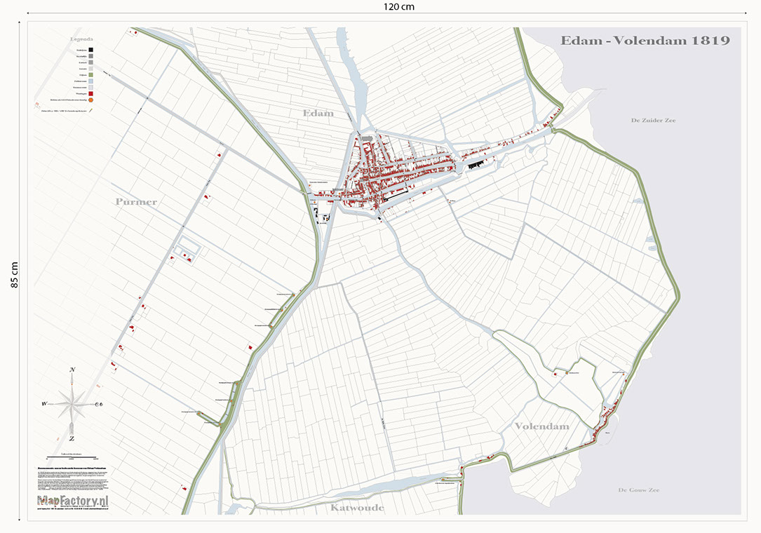 MapFactory heeft de 12 oude kaarten van wat nu Edam Volendam is uit begin 1800 samengesteld en opnieuw getekend. Resultaat, een uniek en zeer gedetailleerd beeld van Edam Volendamvan vlak na de machtswisseling van Napoleon in 1813 en onze eerste Koning Willem I der Nederlanden, Willem Frederik Prins van Oranje-Nassauuit de periode 1813 - 1840.