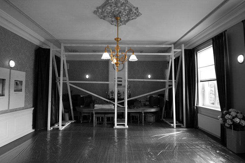 50x75 cm is, hebben we uitvergroot naar 350x525 cm en in perspectief doorgetrokken over de vloer om een zo realistisch beeld te geven van de ruimte. Zelfs de kroonluchter in de ruimte komt in perspectief uit in het schilderij. Dit alles sluit volledig aan bij de regels van het perspectief tekenen van Pieter Janz. Saenredam zoals hij die toepaste.