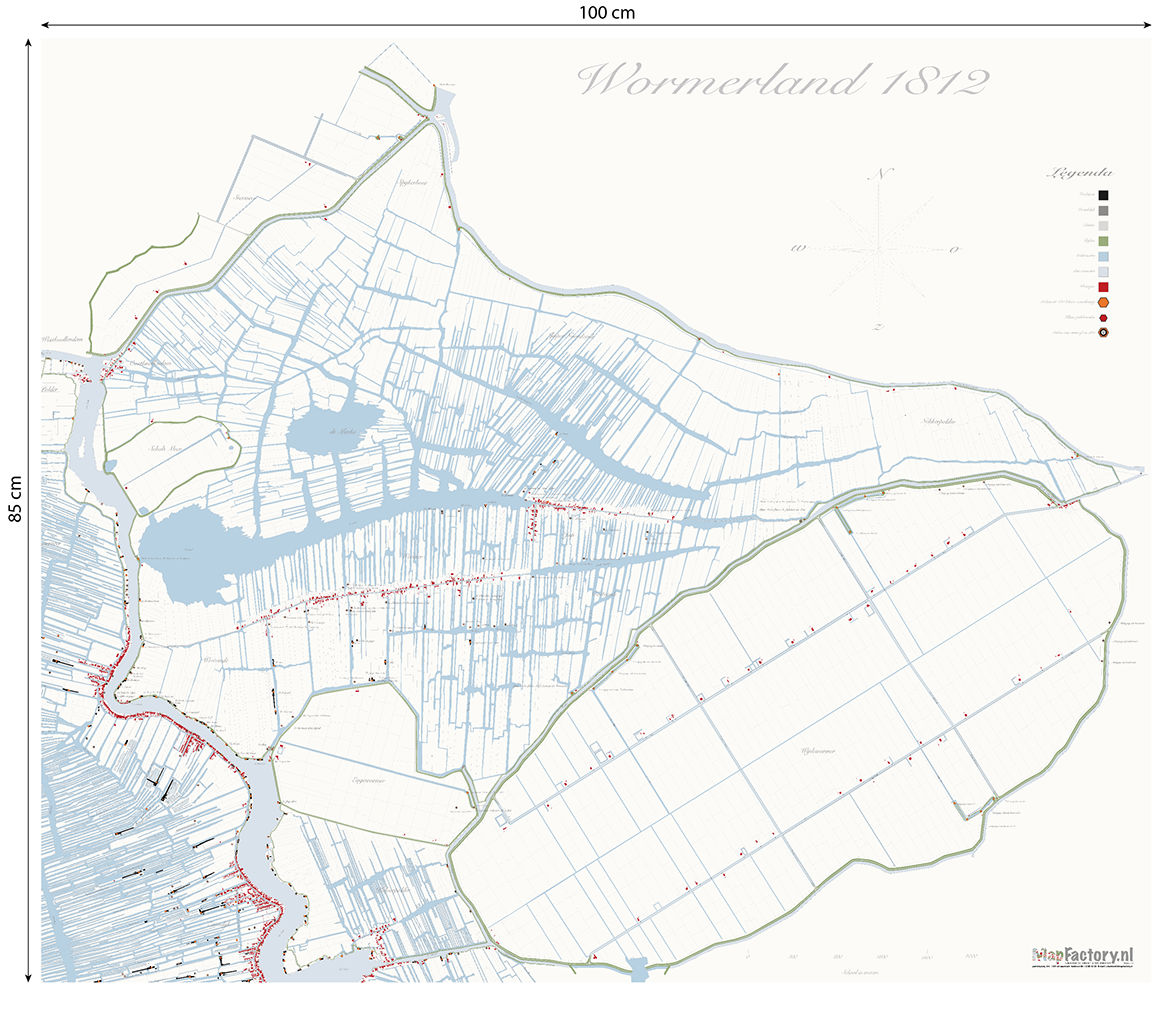 MapFactory heeft de 27 oude kaarten van wat nu Wormerland is uit begin 1800 samengesteld en opnieuw getekend. Resultaat, een uniek en zeer gedetailleerd beeld van Wormerland van vlak na de machtswisseling van Napoleon in 1813 en onze eerste Koning Willem I der Nederlanden, Willem Frederik Prins van Oranje-Nassauuit de periode 1813 - 1840.